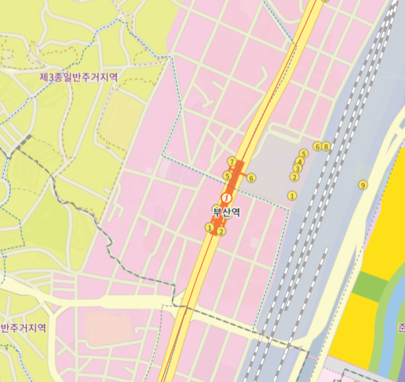위 지도에서 알 수 있듯이 부산역 주변은 상업지역입니다. 상업지역에는 상가, 사무실, 근린생활시설, 오피스텔이 많기 때문에 주택에서만 허가를 받을 수 있는 외국인관광 도시민박업 매물이 많지 않습니다.