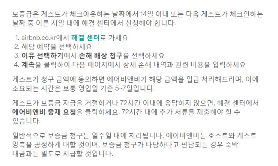 대부분 상식 있는 게스트라면 호스트에게 변상해주는 단계에서 문제가 해결됩니다. 하지만 응답이 없거나 거절하는 게스트도 있을 수 있으므로, 해결센터를 통한 중재가 필요한 경우가 있습니다.